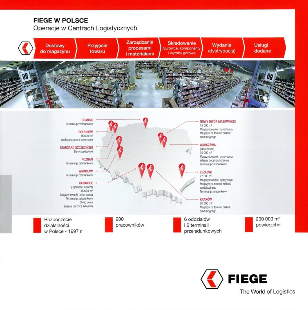 Grupa FIEGE jest obecna na polskim rynku od 1997 r. Swoim klientom oferuje najwyższą jakość usług w zakresie pełnego łańcucha dostaw, dostosowanych do wymogów lokalnego rynku. Na liście klientów obsługiwanych w Polsce znajdują się m.in. firmy: 3M, General Motors/Opel, Pirelli, Continental i Reckitt Benckiser. FIEGE odpowiada za pełen zakres działań logistycznych tych firm, w tym również za ogólnoeuropejską dystrybucję. Łącznie w Polsce znajdują się cztery Centra Logistyczne i dwa terminale FIEGE.