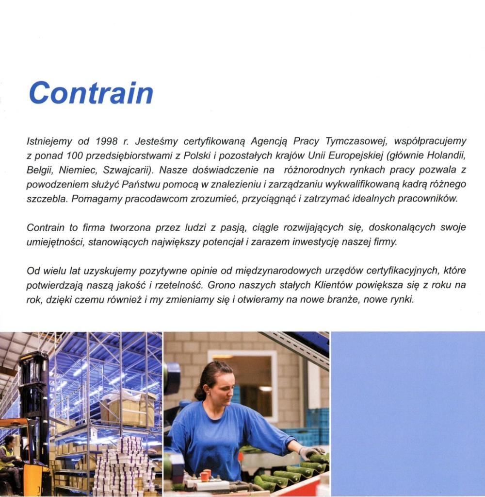 Rodzina firm Contrain współpracuje z ponad 100 przedsiębiorstwami z Polski i pozostałych krajów Unii Europejskiej (głównie Holandii). Nasze wieloletnie doświadczenie pozwala służyć pomocą naszym Klientom w efektywnym zarządzaniu zasobami ludzkimi, w tym w znalezieniu i zarządzaniu wykwalifikowaną kadrą różnego szczebla na najwyższym poziomie jakości.