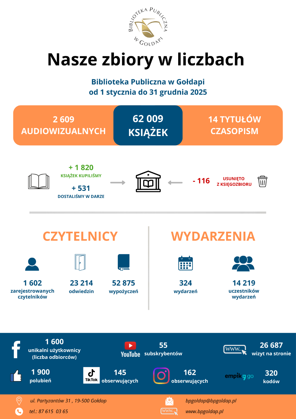 Biblioteka Publiczna w Gołdapi to miejsce, które od 8 dekad służy mieszkańcom w zdobywaniu wiedzy, rozwijaniu zainteresowań oraz spotkań z kulturą. Oferuje bogaty księgozbiór, który liczy ponad 62 tysiące książek dla każdego czytelnika – niezależnie od wieku. Placówka regularnie wzbogaca swoje zbiory o nowości wydawnicze. Organizuje liczne wydarzenia kulturalne i edukacyjne, spotkania autorskie, warsztaty, konkursy czytelnicze. To również miejsce spotkań i integracji mieszkańców miasta promujące czytelnictwo. Z inicjatywy biblioteki powstała w naszym mieście szafa bookcrossingowa, w której czytelnicy wymieniają książki.